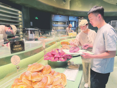 4月13日,记者在太原万象城走访时看到,高端烘焙品牌入口天物山西首店内客流涌动,全透明现烤工坊飘出阵阵麦香,动态面包出炉时钟实时更新,不少消费者驻足打卡、挑选心仪产品,店员正忙着切片、打包,一派热闹的消费景象。