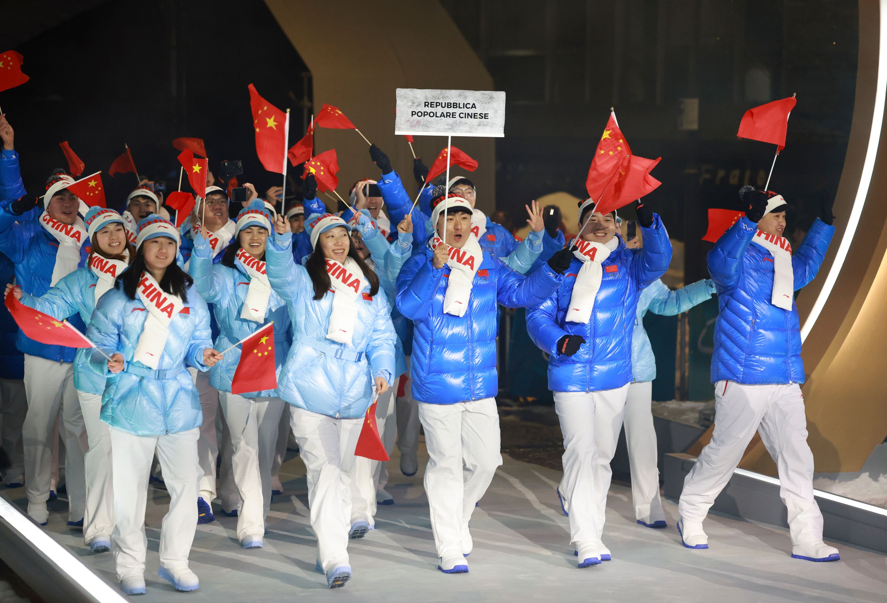 中国体育代表团在宁忠岩、张楚桐两位旗手引领下步入现场,以往熟悉的“中国红”变成了冰雪的模样。中国冰雪健儿的每一步,都踏着滚烫的梦想。