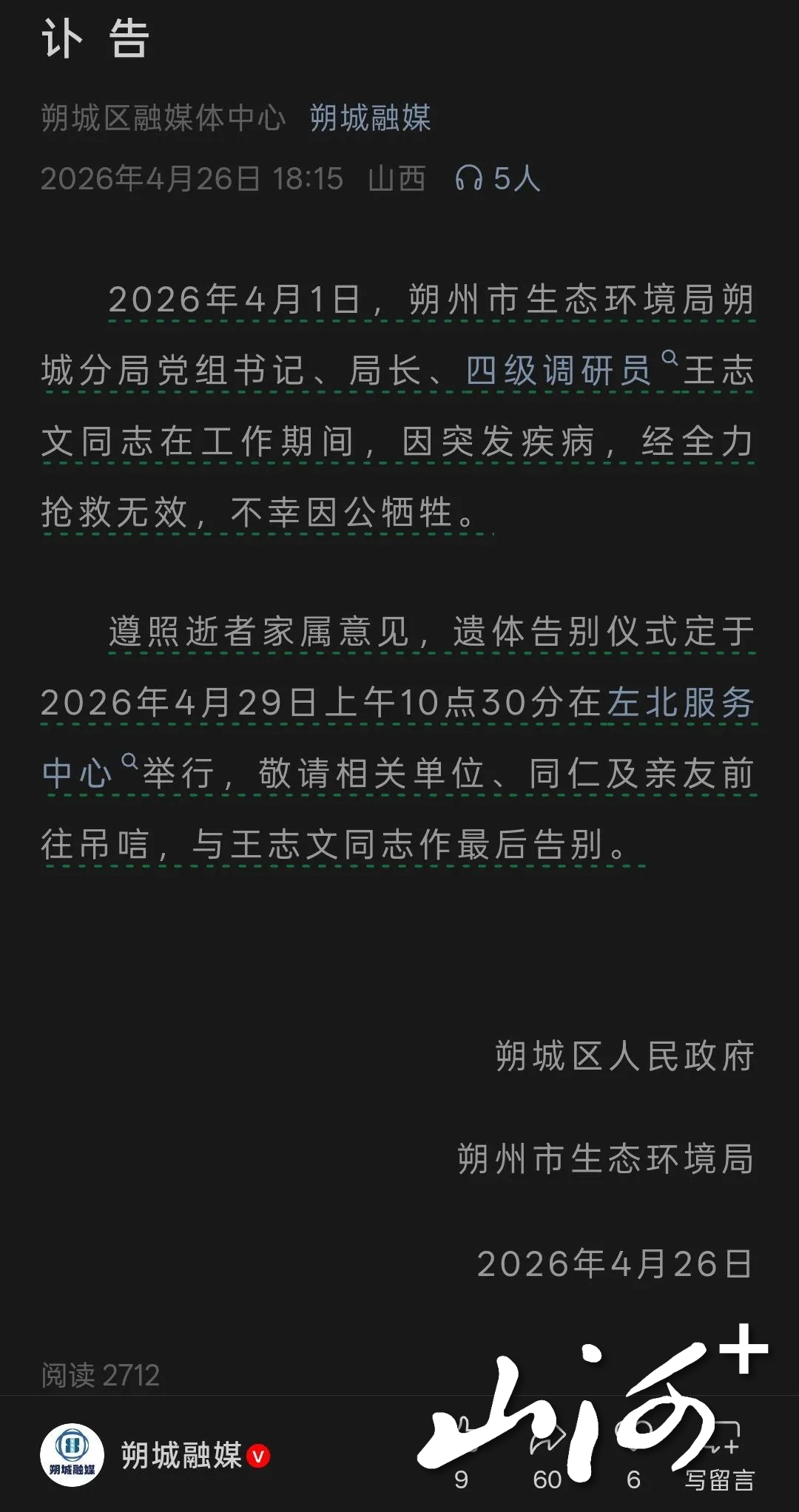 山西晚报·山河+讯 4月26日,山西晚报·山河+记者从朔州市朔城区获悉,2026年4月1日,朔州市生态环境局朔城分局党组书记、局长、四级调研员王志文同志在工作期间,因突发疾病,经全力抢救无效,不幸因公牺牲。遵照逝者家属意见,遗体告别仪式定于4月29日上午10点30分在左北服务中心举行。