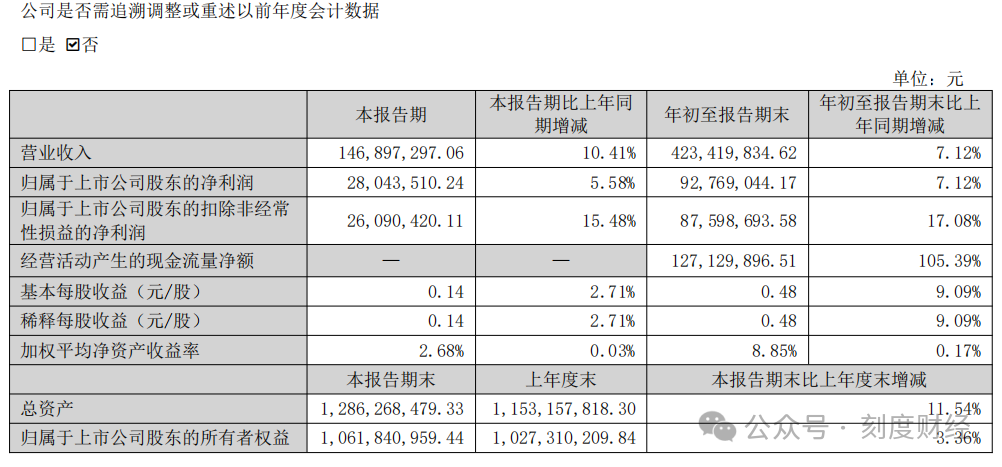 2025年前三季度,公司实现营业收入4.23亿元,归母净利润9276.90万元,两项指标同步增长7.12%。扣非归母净利润达8759.87万元,增速高达17.08%。