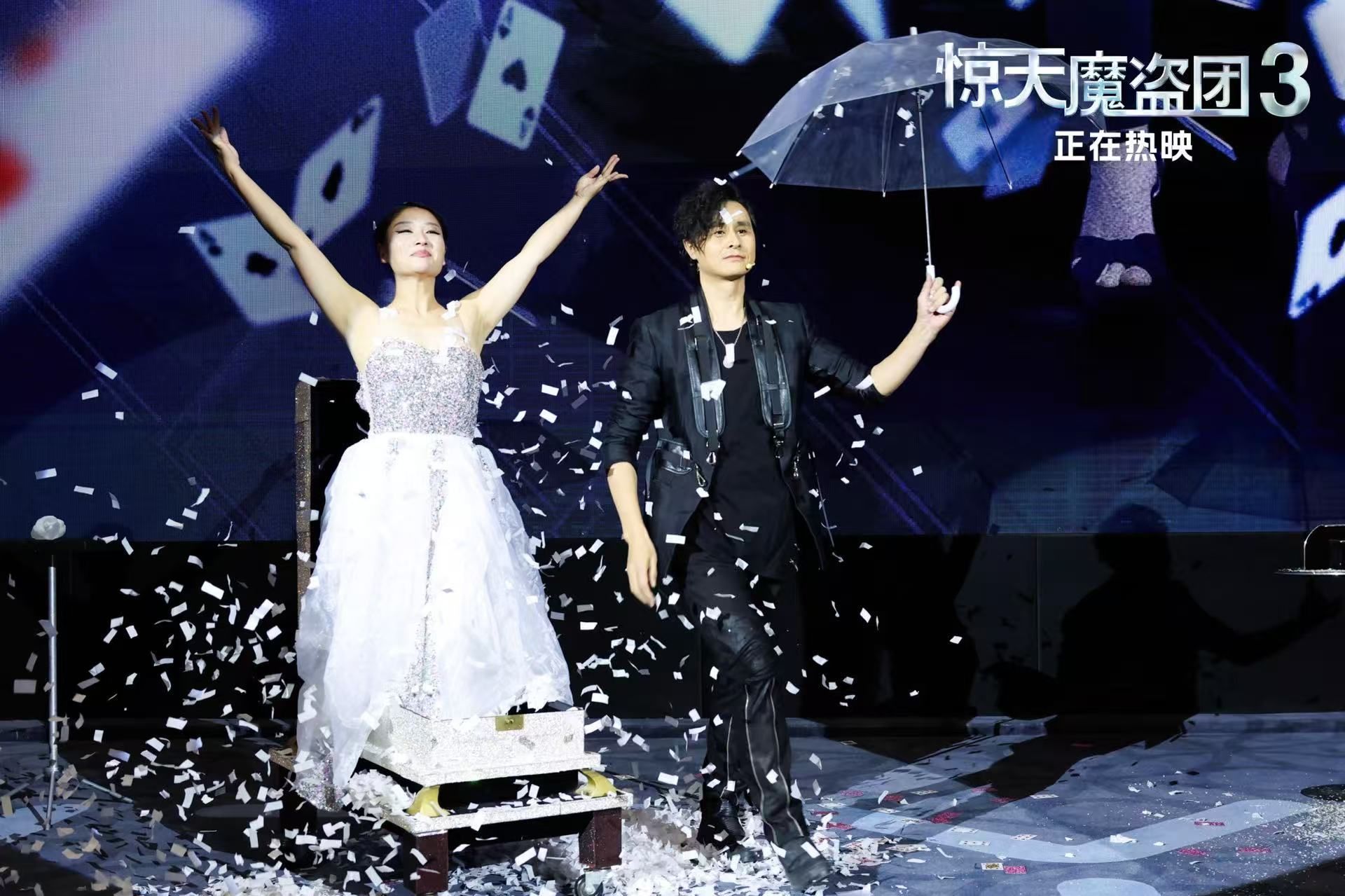 这份对魔术表演的极致追求,在中国首映礼现场得到完美延续。魔术师刘世杰率先开场,复刻影片“钻石恒久远”名场面,还原“骑士团”神偷绝技——覆盖钻石的布料被揭开的瞬间,凭空消失的钻石又神奇重现,引发现场观众惊呼不断。当钻石应声爆破的瞬间,全场喝彩声四起,观众的热情也被彻底点燃:“银幕内看‘骑士团’顶级魔术炫技,银幕外亲眼见证魔术师即时复刻,真是过足了眼瘾!”魔术师更重现影片中“扇子飞雪”的名场面,徒手搓出漫天雪花,而伴随着雪花纷飞,女魔术师的黑衣秒变白裙,奇幻画面令人震撼不已。