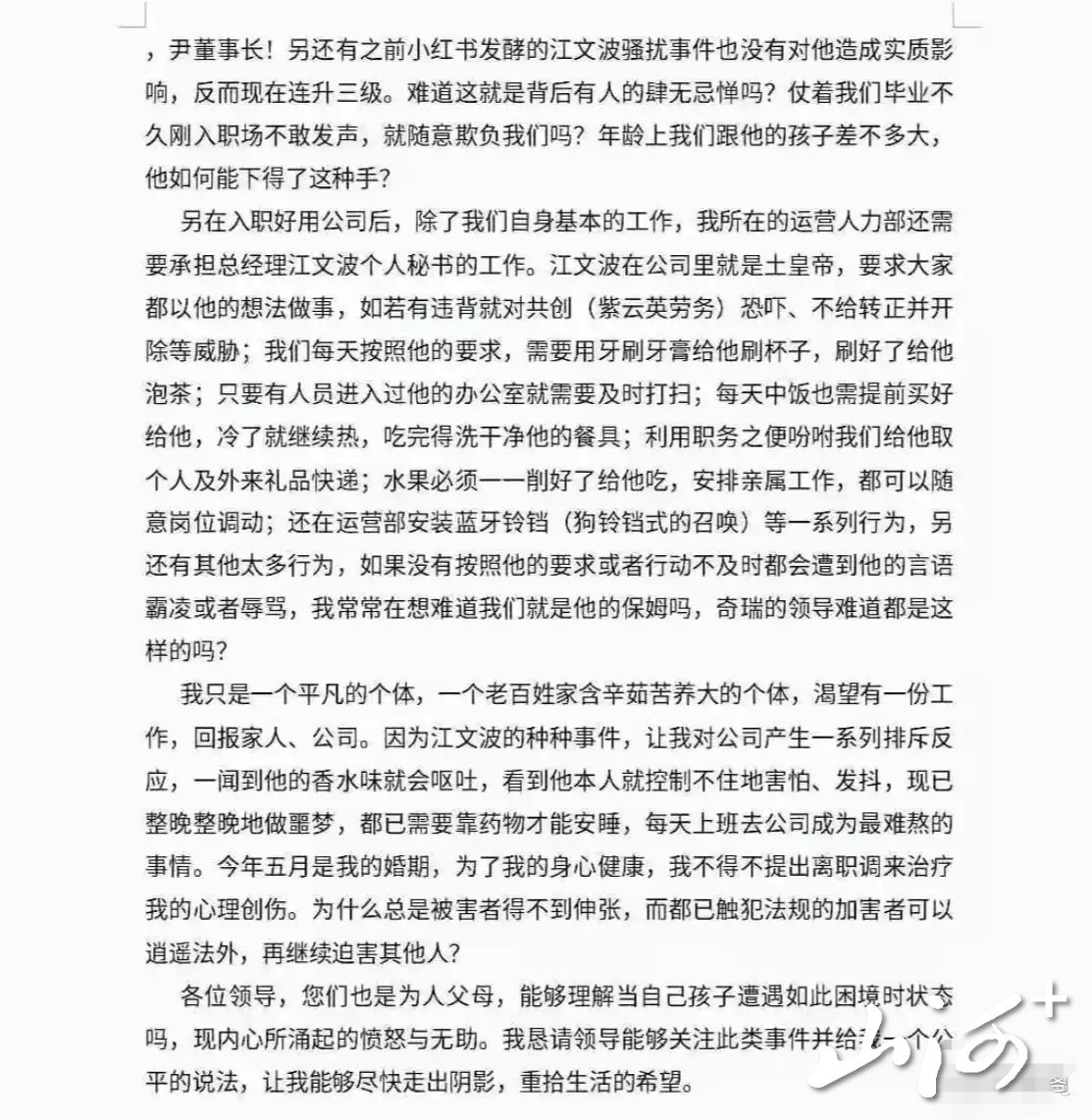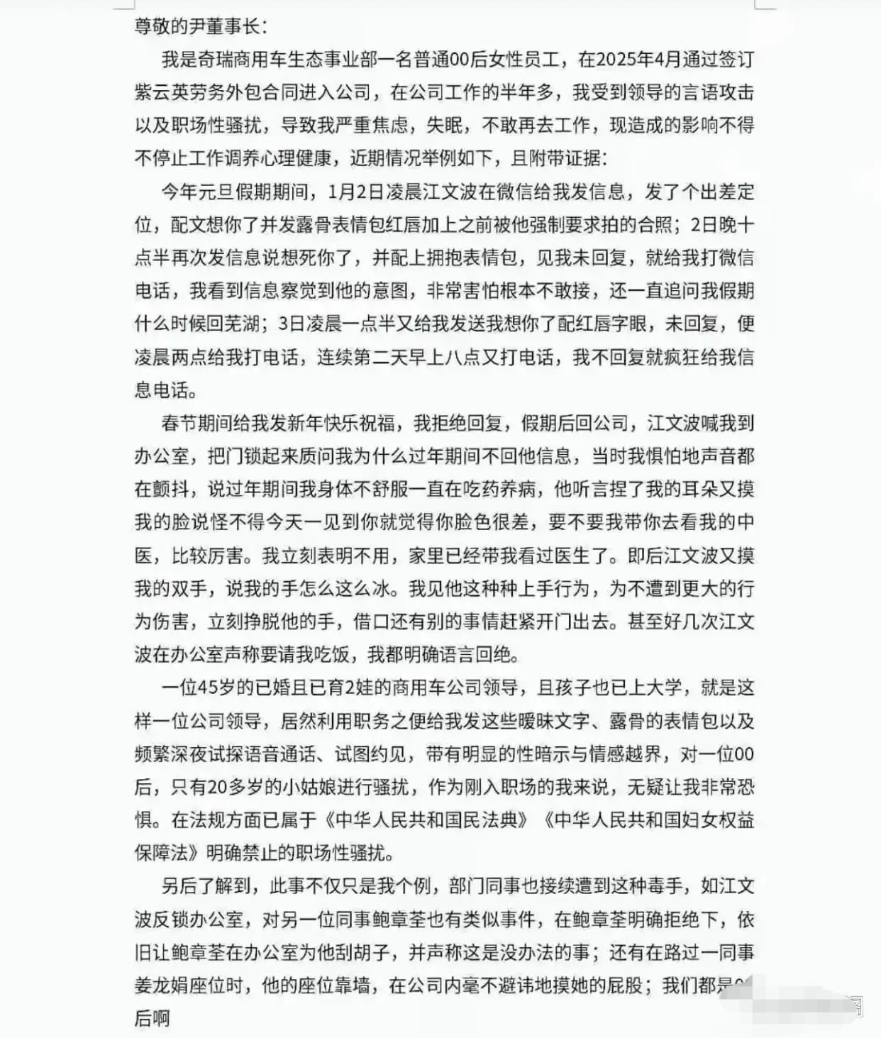 山西晚报·山河+讯 近日,一封实名举报信在网络社交平台广泛流传,引发舆论高度关注。举报人为奇瑞商用车(安徽)有限公司生态事业部一名“00后”女员工,实名指控公司管理人员江某某对其实施性骚扰。