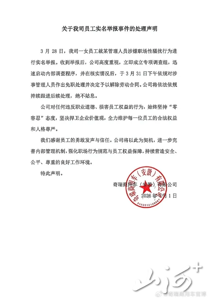 山西晚报·山河+记者注意到,奇瑞商用车(安徽)有限公司在声明中表示,公司于3月28日收到实名举报后,第一时间成立专项调查组开展核查,经核实相关情况,已于3月31日下午对涉事管理人员作出免职处理,并解除劳动合同。