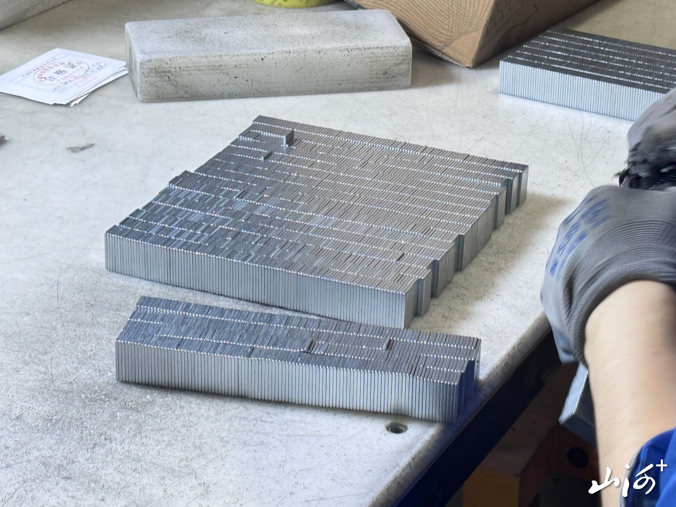 在中磁科技技术部员工尉江的引导下,采访团走进熔炼、成型、烧结及精密加工车间,全程观摩高性能烧结钕铁硼稀土永磁材料的生产全流程。从原材料的精准配比、智能化设备的高效运转,到每道工序后严格的质量检测,企业对“精益制造”的坚守与技术工艺的成熟度,给采访团留下深刻印象。据介绍,该类产品广泛应用于新能源汽车、风力发电、工业自动化等核心领域,其中轮毂电机磁钢国内市场占有率达40%,已获评“制造业单项冠军产品”。在城市的大街小巷,路上跑的雅迪、爱玛、新日等主流两轮车,很多都装着这颗“动力心脏”。据了解,今年单是雅迪一家,就从中磁采购了超500万套磁钢!