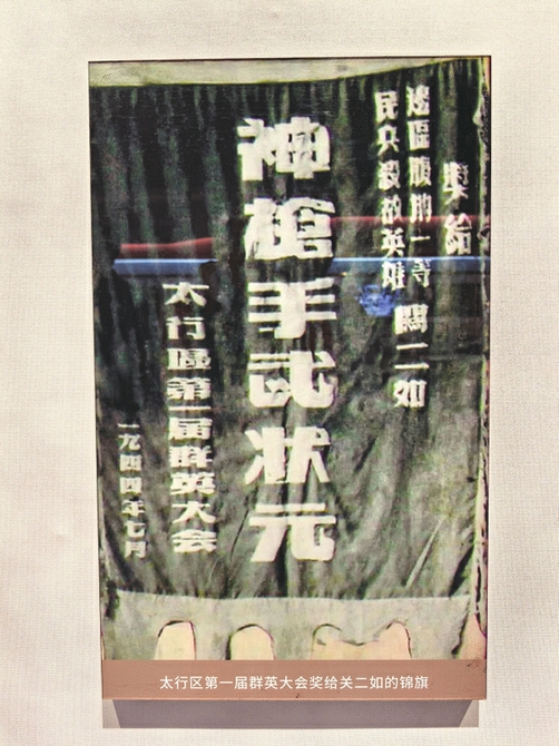 杀敌英雄关二如在1944年太行区首届群英大会上荣获的“神枪手武状元”锦旗,现珍藏于中国人民革命军事博物馆。