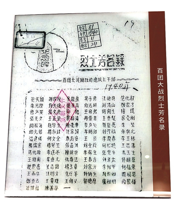 这是一份在太原解放纪念馆山西革命英烈展展出的1940年百团大战烈士名录,其中记载了牺牲的连以上干部,董天知烈士的姓名在名录第一位。
