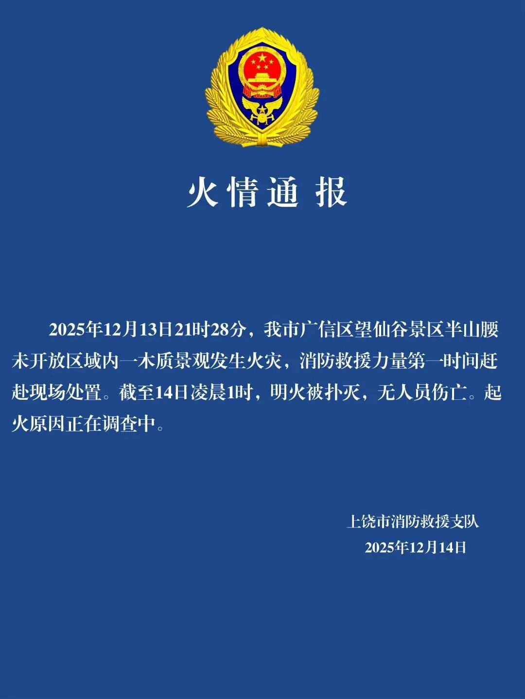 山西晚报·山河+记者注意到,12月14日凌晨,上饶市消防救援支队发布火情通报:2025年12月13日21时28分,广信区望仙谷景区半山腰一处未开放区域内的木质景观发生火灾。消防救援人员迅速赶到现场处置。截至14日凌晨1时,明火已被扑灭,无人员伤亡。火灾原因正在调查中。14日景区仍可正常预约。
