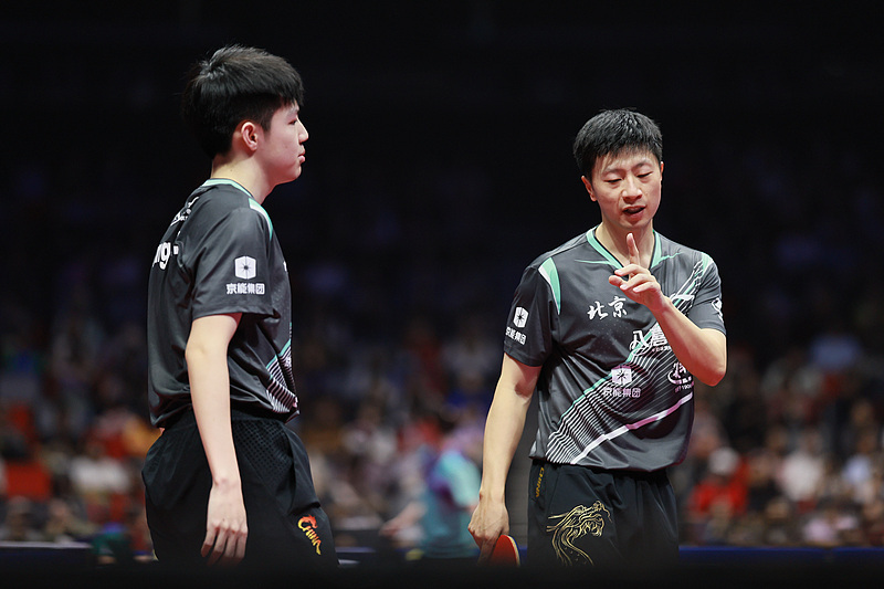 △乒乓球男子团体小组赛,北京队马龙、黄友政在比赛中。