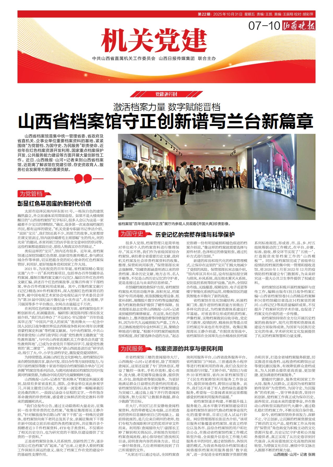 紧随时代脚步,服务党和国家工作大局、服务人民群众,正是因为省档案馆始终坚持“为党管档、为国守史、为民服务”的有机统一,坚守神圣职责,坚持开拓创新,使档案工作真正成为保存历史、滋养现实、启迪未来的重要事业,并在推动山西转型实践的时代大潮中,通过稳扎稳打的档案工作,不断实现自身价值。