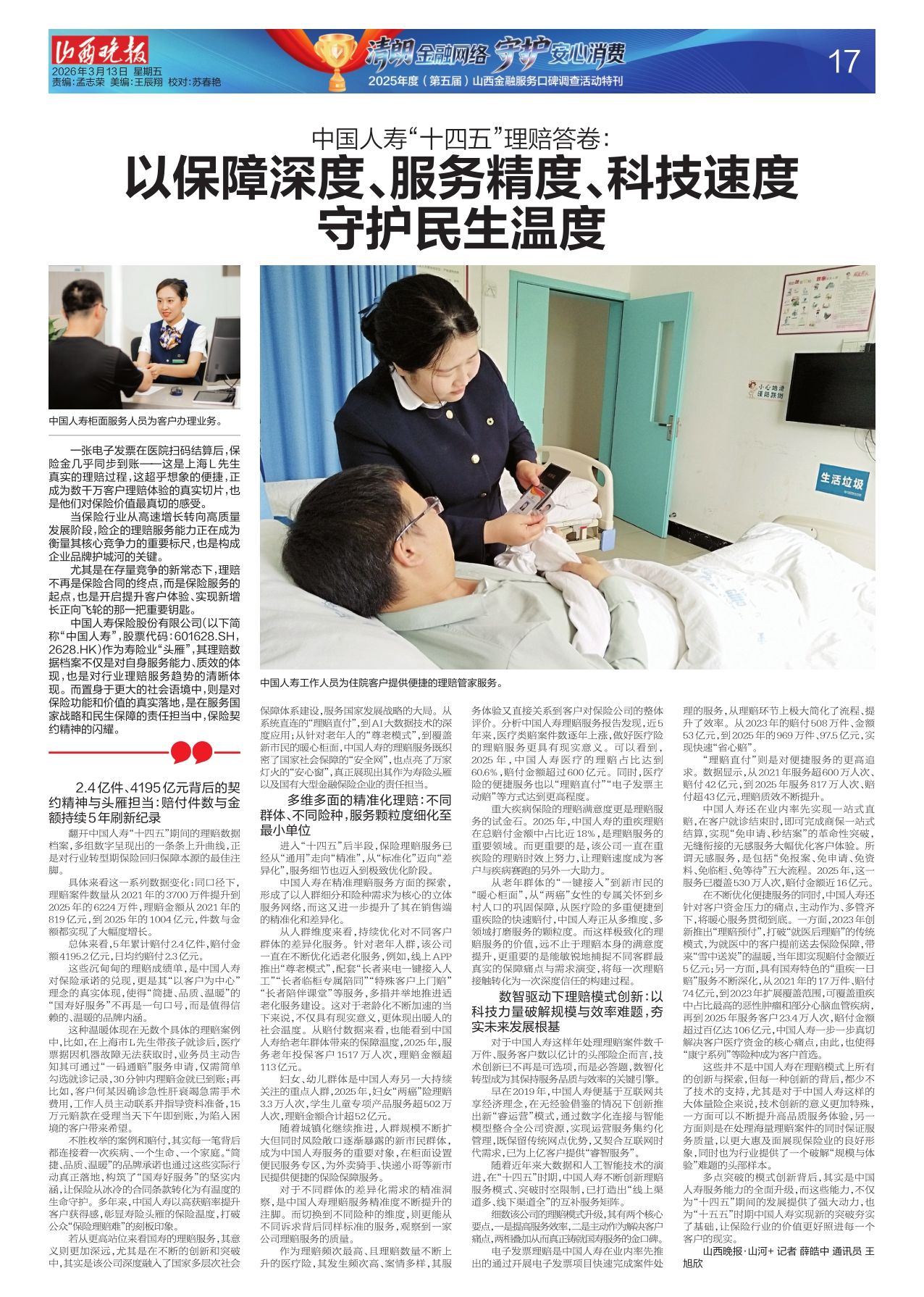 从人群维度来看,持续优化对不同客户群体的差异化服务。针对老年人群,该公司一直在不断优化适老化服务,例如,线上APP推出“尊老模式”,配套“长者来电一键接入人工”“长者临柜专属陪同”“特殊客户上门赔”“长者陪伴课堂”等服务,多措并举地推进适老化服务建设。这对于老龄化不断加速的当下来说,不仅具有现实意义,更体现出暖人的社会温度。从赔付数据来看,也能看到中国人寿给老年群体带来的保障温度,2025年,服务老年投保客户1517万人次,理赔金额超113亿元。