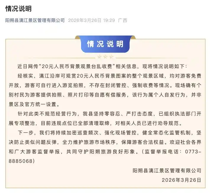 据广西桂林阳朔县融媒体中心3月26日发布的《阳朔县漓江景区管理有限公司的情况说明》指出,经核查,漓江沿岸所有可观赏20元人民币背面图案的观景区域,均属公共开放空间,对游客免费开放,游客可自由进入、自行游览拍照,不存在封闭管控或强制收费情形。现场确有个别村民自发为游客提供拍照、照片打印等有偿服务,但该行为并非景区或官方统一设置,亦未经授权,属个人经营行为。