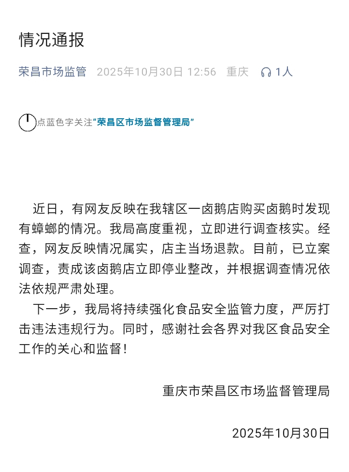 山西晚报·山河+讯 近日,有网友在社交平台发帖称,在重庆市荣昌区一家卤鹅店买熟食时发现蟑螂爬过熟食。10月31日,山西晚报·山河+记者从重庆市荣昌区市场监督管理局获悉,网民反映情况属实,该店已停业进行整顿。