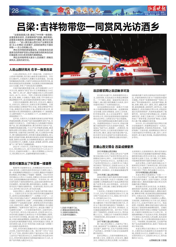 本届文博会上,酒旅文化产业是吕梁市展示重点之一。吕梁市正在全力打造山西杏花村酒文旅融合项目,该项目总体规划概括为“一点两轴三片区”。一点“即以杏花村遗址为原点”,两轴即贯通东西的杏花村古遗址、汾酒老作坊、汾酒厂、中国汾酒城、世界清香酒庄集群的“产业发展历史轴”,贯穿南北的杏花村遗址公园、诗意杏花村、酒源广场、汾阳市博物馆(含白酒祖庭博物馆)、“如梦杏花村”演艺中心、酒文旅小镇的“文化演绎历史轴”。三片区即诗意杏花村、文旅杏花村、产业杏花村,项目总占地5000亩,总投资200亿元。杏花村酒文旅融合主体项目位于杏花村镇核心地带,包含杏花村古村修复、酒文旅小镇、仰韶文化遗址公园、中国白酒祖庭博物馆,汾酒老作坊、太符观、汾酒厂区及周边村落风貌提升改造,杏花村高速出口改造、杏花村清香大道、旧307杏花村段(汾酒大道)与两侧门店立面提升改造等项目。