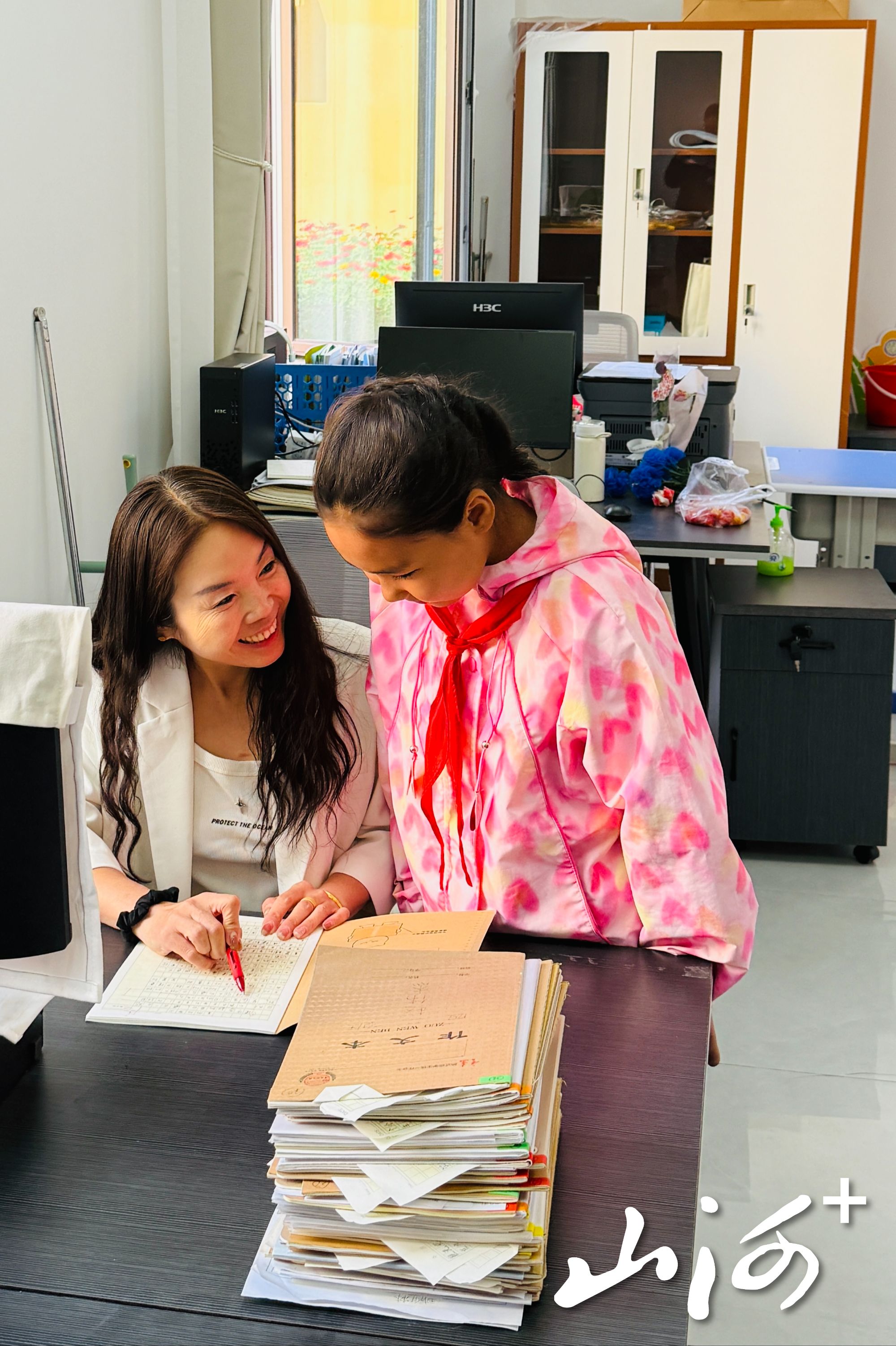 同样践行“做一名有温度的良师”理念的,还有50公里之外的阜康市晋和小学的山西援疆教师杨莉。9月15日,采访团一行来到晋和小学,杨莉正在办公室给四年级学生恩卡·马吉提讲解习题册上的问题。