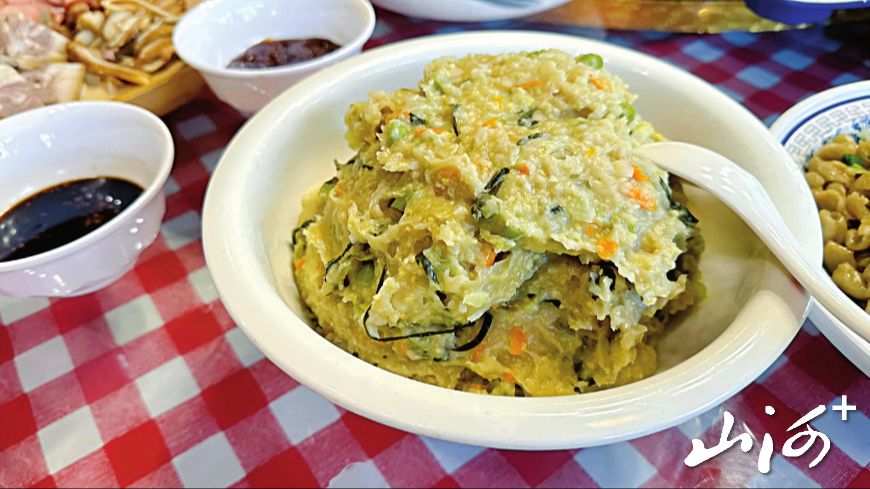 榆社葱炒笨鸡蛋:以榆社笨鸡蛋、胡麻油炒制而成,软糯鲜香。