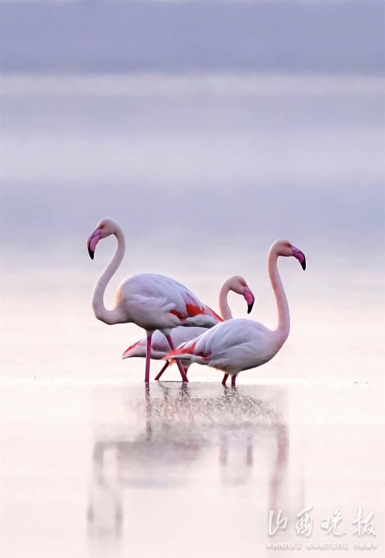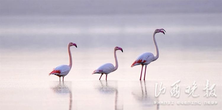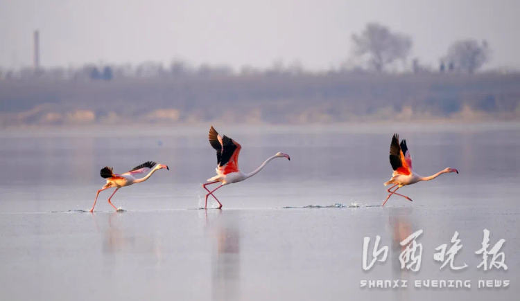 随着运城市生态环境不断优化,野生火烈鸟已连续多年飞抵盐湖栖息越冬。盐湖含有丰年虾及丰富的藻类,为火烈鸟提供了充足的食物, 其淡水咸水兼具的特性也是火烈鸟常年选择在这里栖息的原因之一。
