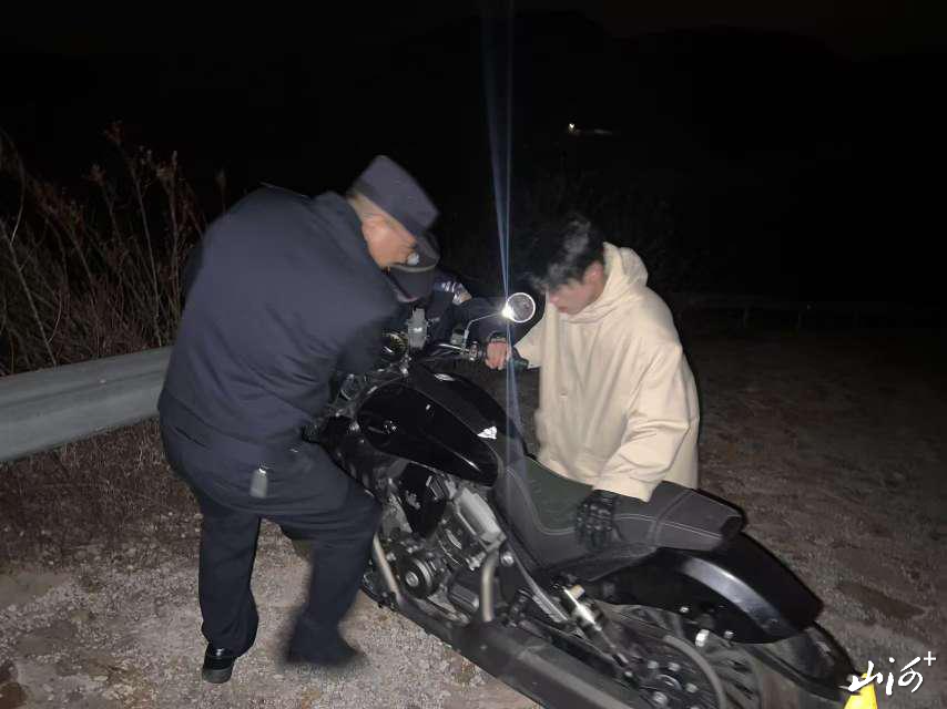 11月10日晚,太原晋祠派出所接到报警,一名年轻骑行者称其摩托车在天龙山石窟附近一条碎石小道上陷入坑内无法移动,且手机电量告急,情况危急。考虑到山区夜间气温骤降、信号可能中断的风险,民警在获取确切位置信息后,立即携带救援工具驱车并徒步赶赴现场。