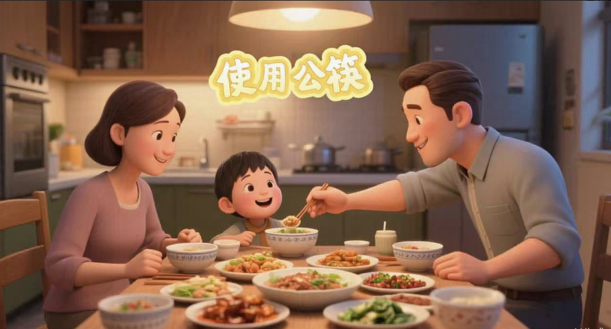 每人一份餐具一碗饭,菜可以集中盛放,但坚决使用公筷公勺夹菜;给孩子、老人夹菜时用公筷,不要用自己的筷子直接喂。