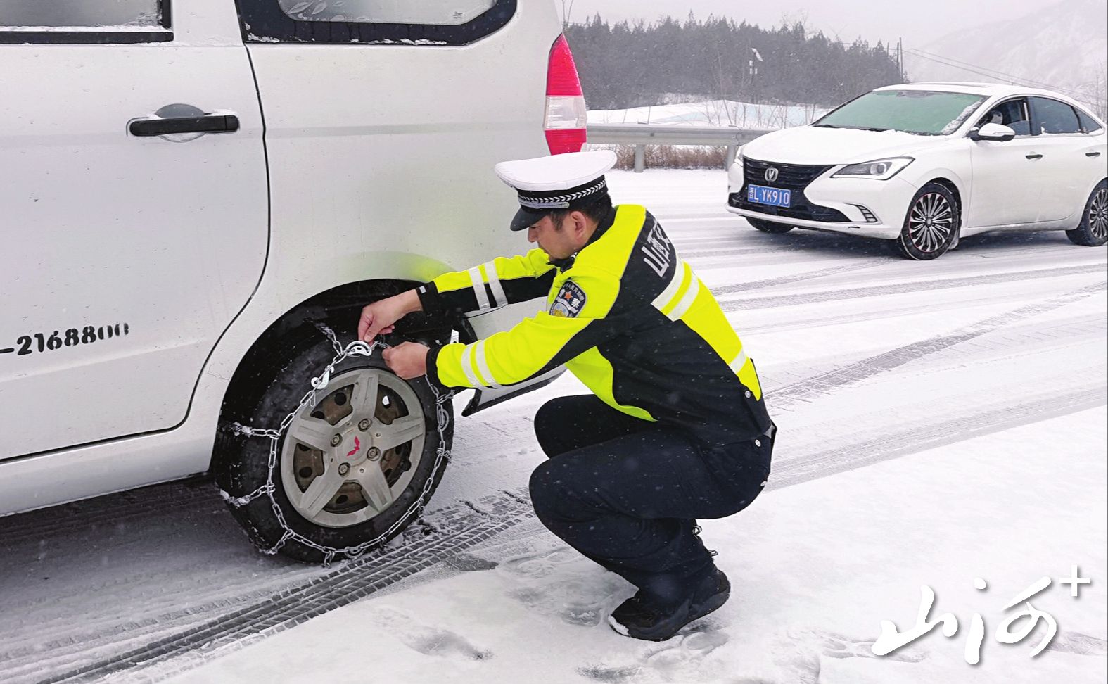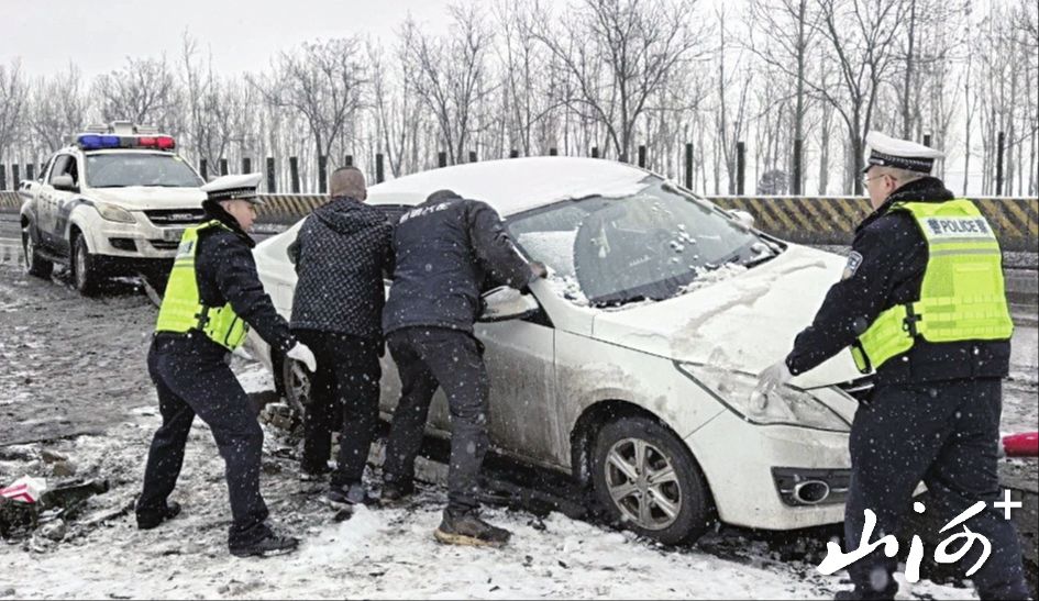 在省道203线湿滑的路面上,车辆打转难行。辅警王继春立即化身“推车侠”,不遗余力地助推车辆脱困。在县城主要路口、在国道239线抢风岭路段、在国道336线高速西口路段,遍布交警身影,大队领导全部下沉一线,指导做好恶劣天气道路交通安全应急应对工作。“你好,雪天路滑,路面容易结冰,有需要帮助的地方,随时联系我们。”这是过往车辆驾驶员听到最多的话。
