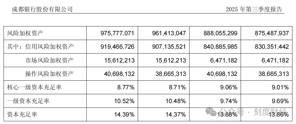 成都银行核心一级资本充足率从2024年末的9.06%降至8.77%,缓冲空间收窄。