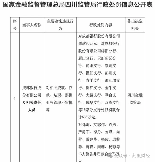 监管层面,年末四川金融监管局的处罚通报引发行业关注,成都银行及旗下15家分支行因贷款、存款、贴现、票据等业务管理不审慎合计被罚725万元,13名分支行行长等责任人同步领受警告与罚款。这已是该行年内第三次受罚,此前还因基金销售内控缺陷、外汇业务违规先后收到警示函与罚没通知。
