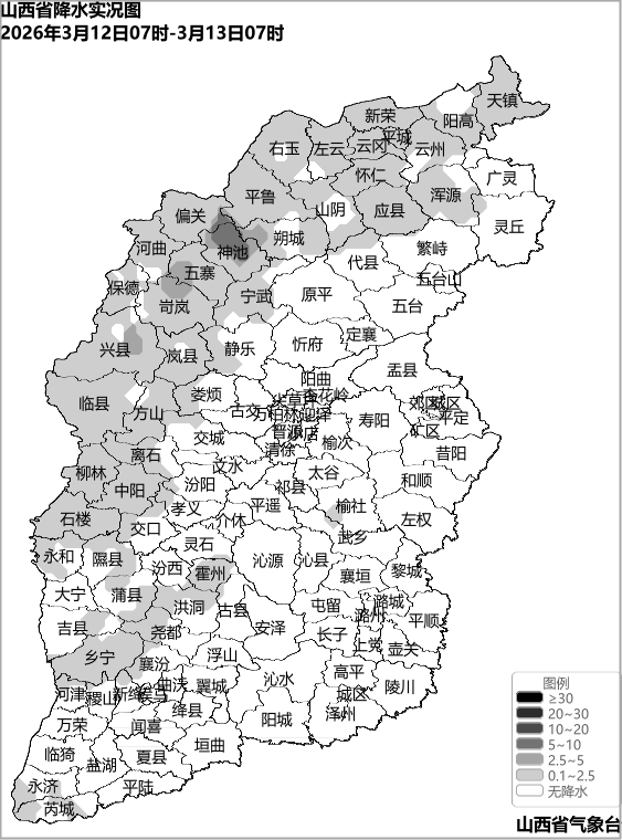 3月12日07时至13日07时,朔州和吕梁的大部,大同、忻州和临汾的部分,太原、晋中和运城的局部共44个县(市、区)出现降水,降水量介于0.1~6.4毫米之间,前3位出现在:神池烈堡(6.4)、神池马坊(5.3)、兴县(3.1)。其中,神池在5毫米以上,兴县、朔城区、岢岚共3个县(市、区)在2.5~5毫米之间,平鲁区、保德、偏关、左云、临县、乡宁、五寨、怀仁、右玉、云州区等40个县(市、区)在0.1~2.5毫米之间。