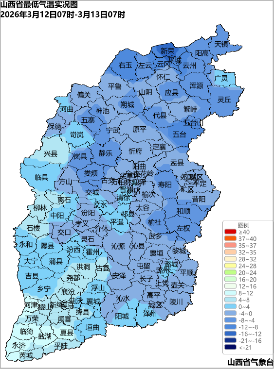 3月12日07时至13日07时,全省各地最低气温介于-12.6℃(新荣区)~9.5℃(夏县)之间。阳泉和朔州的全域,太原、大同、长治、晋中和忻州的大部,晋城和吕梁的部分,临汾的局部共69个县(市、区)最低气温在0℃以下,其中,右玉、云冈区、新荣区共3个县(市、区)在-10℃以下。