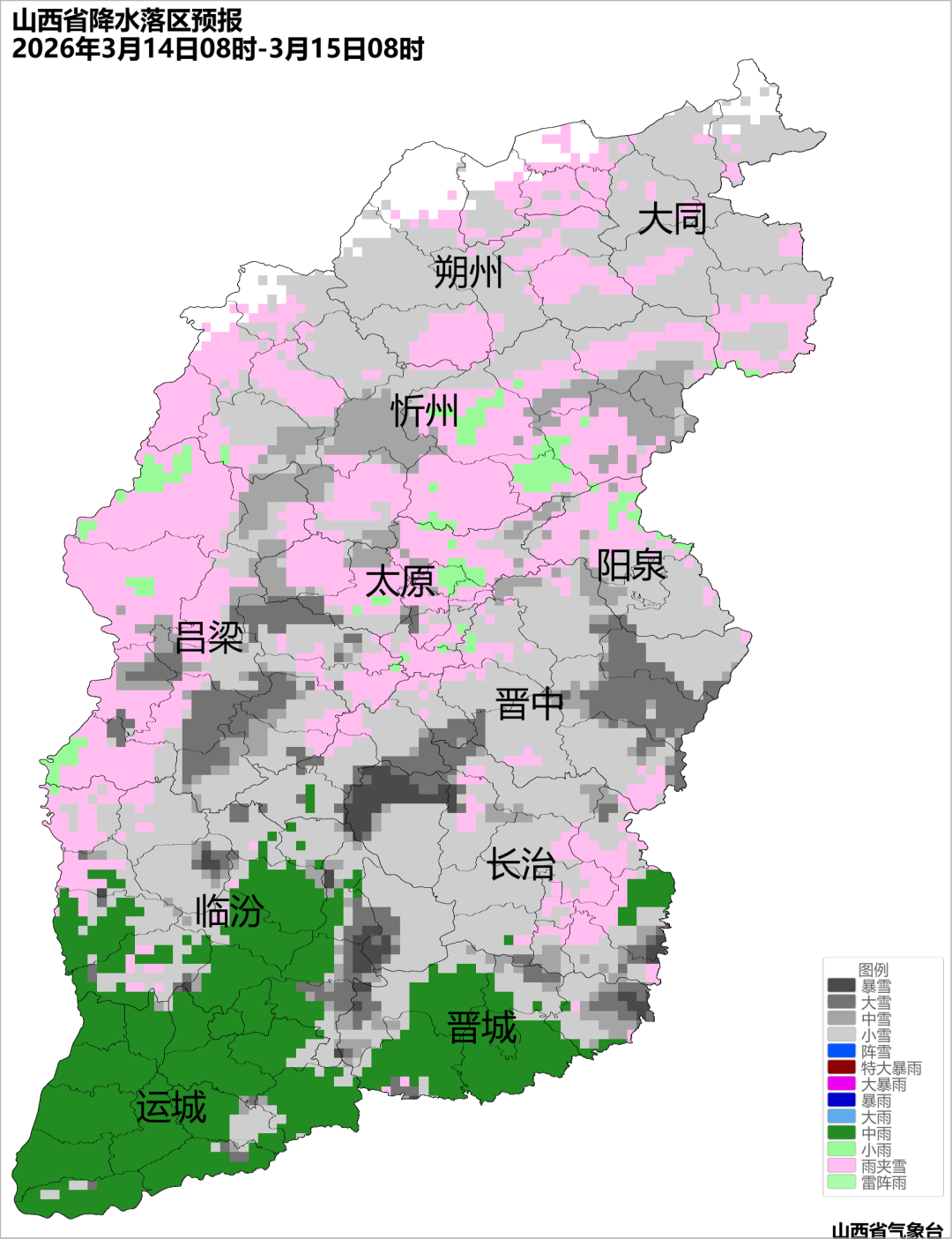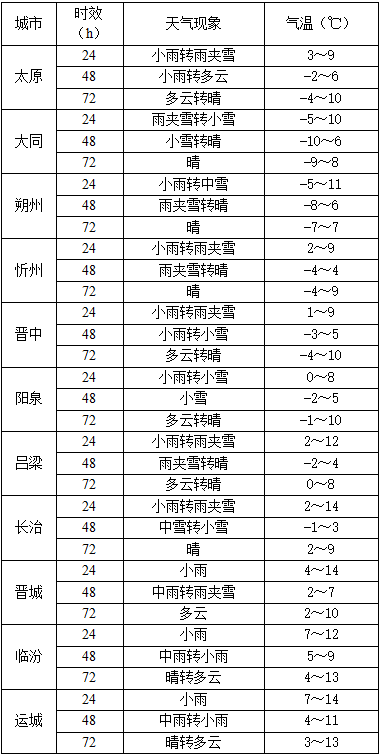 全省阴天,有小雪或雨夹雪,北中部部分和南部局部山区有中到大雪,忻州、太原、吕梁、晋中、阳泉、长治等地的局部地区有大到暴雪;南部部分地区有小雨,局部地区有中雨。最高气温:全省6~15℃;最低气温:北部及中南部山区-7~2℃,中南部其余地区2~8℃。