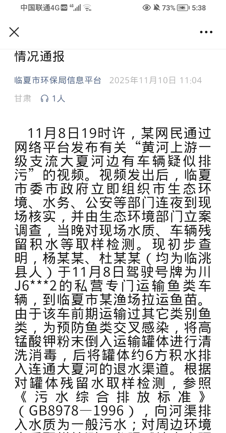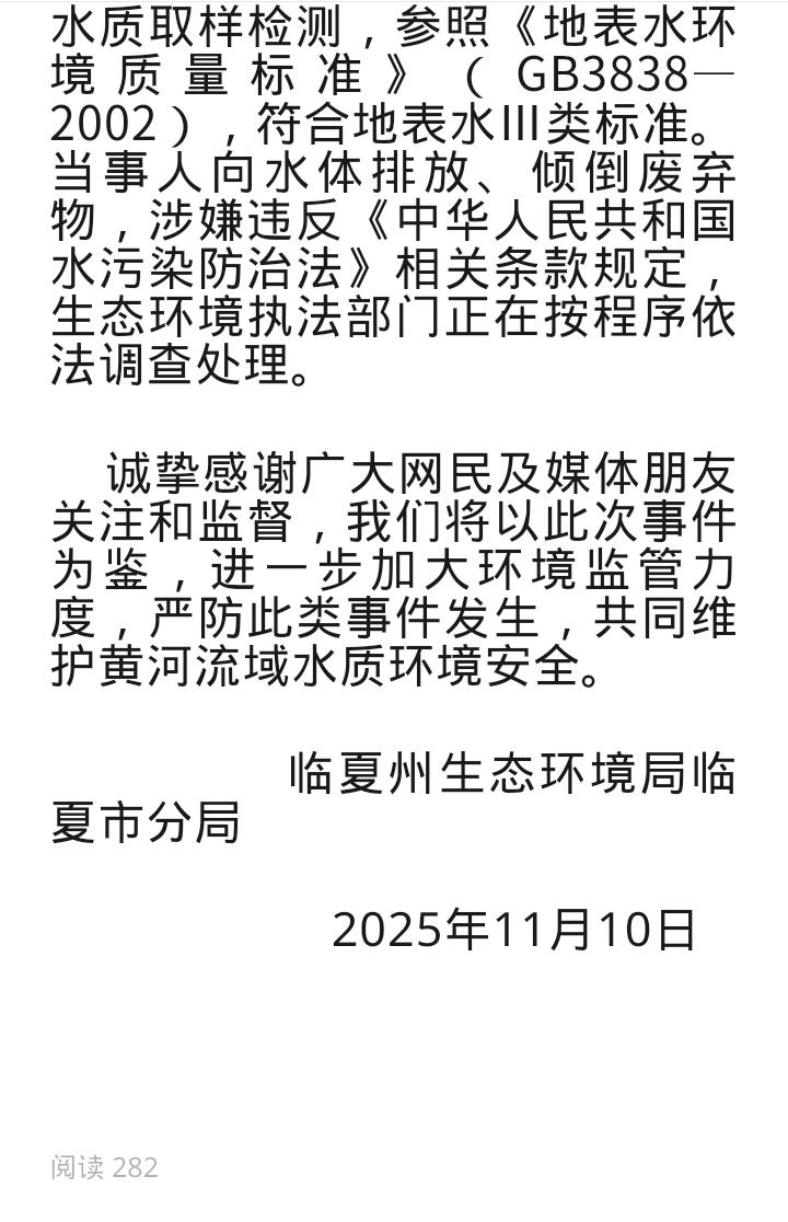 11月10日,山西晚报·山河+记者致电临夏市环保局,一位工作人员表示,该局接到群众举报后已迅速开展调查。根据临夏市环保局10日发布的情况通报,初步查明:杨某某、杜某某(均为临洮县人)于11月8日驾驶号牌为川J6***2的私营活鱼运输车,前往临夏市某渔场拉运鱼苗。因该车此前运输过其他类别鱼类,为预防交叉感染,当事人将高锰酸钾粉末倒入运输罐内进行清洗消毒,随后将罐内约6立方米的积水排入连通大夏河的退水渠道。