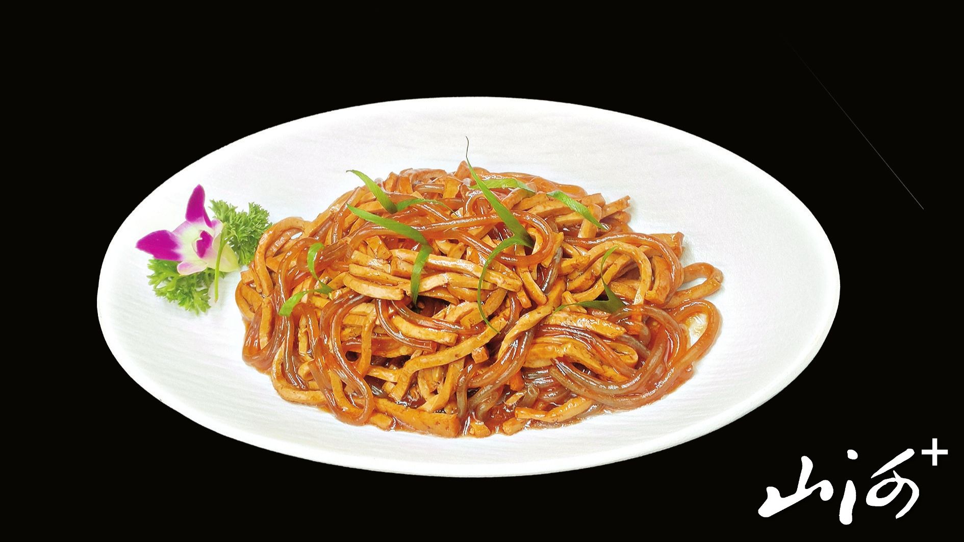 豆腐丝在平定叫做粉条豆腐丝,是红白喜事、逢年过节少不了的一道传统菜。这道菜看着温和,一点热气都没有,端上桌来,你不以为意地夹一筷子送进嘴里,准会被烫得倒吸一口气。它的烫在于豆腐片要先切成半厘米厚薄,下油锅炸至表皮焦黄,再切丝,和泡好的粉条一起烧制,出锅前浇一勺滚烫的热油,把整道菜的热气紧紧裹住,一丝都不让它外泄。外表平静无波,内里滚烫炽烈,像极了山里人的脾性,不声不响,心里却有一团火。
