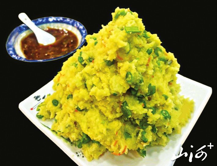 糊嘟本是山村苦寒人家的日常饭食。锅里放水,把土豆、豆角切块丢进去煮,水开了就沿着锅边转着圈撒玉米面,中间留个气眼,盖上锅盖用慢火蒸煮。等水耗得差不多了,就到了最见功夫的工序——两个人操作,一个把稳锅沿,一个拿擀面杖急速搅动,让面、菜、水三者紧密融合。搅得不匀,面里就会夹生疙瘩;火候不到,糊嘟就黏黏糊糊不成形。做好了盛出来,色泽金黄,香味四溢,蘸上辣椒土豆,一口下去,软糯中带着粗粝,温热中透着醇厚。早年移民垦荒、乡民劳作,全靠这一口糊嘟果腹;如今日子富足,它依旧是餐桌上的常客。糊嘟耐饥、抗寒、阻风湿,冬天落了雪,阳泉人总要做上一大锅,一家人围坐在一起,伸筷子到锅里夹糊嘟来吃,外出的人讲着异乡的见闻,留守的人说着山间的变化,人口的聚散,全都融在这一锅软糯里。