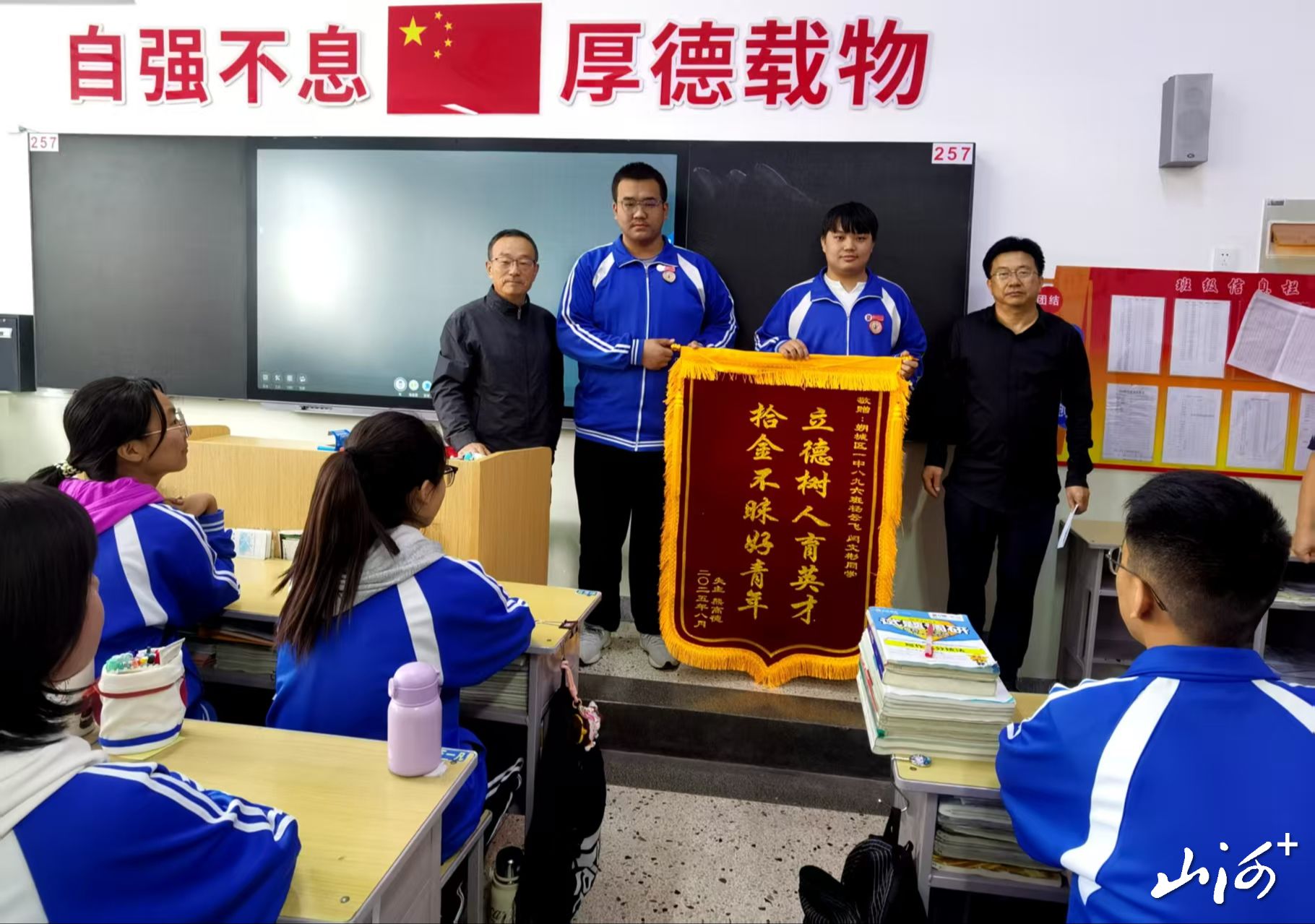 山西晚报·山河+讯 9 月 23 日上午,朔州市退休教师熊高德将一面写有 “立德树人育英才 拾金不昧好青年” 的锦旗,送达朔城区一中 896 班,这面锦旗背后,藏着一段温暖的拾金不昧故事。直到此时,学校老师和班级同学才知晓,班里杨云飞、闫文彬两名学生几天前悄悄做了一件好事。