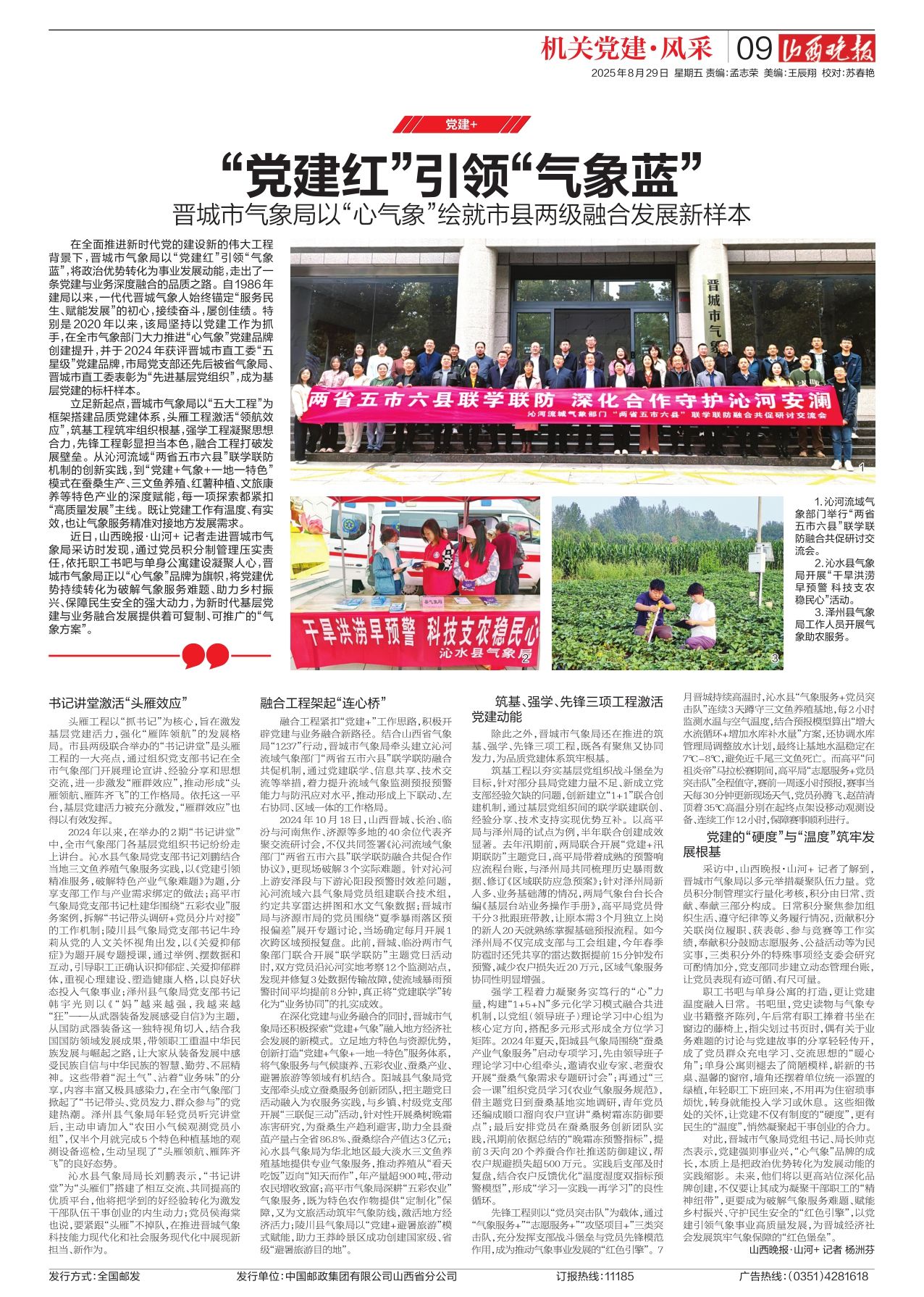近日,山西晚报·山河+记者走进晋城市气象局采访时发现,通过党员积分制管理压实责任,依托职工书吧与单身公寓建设凝聚人心,晋城市气象局正以“心气象”品牌为旗帜,将党建优势持续转化为破解气象服务难题、助力乡村振兴、保障民生安全的强大动力,为新时代基层党建与业务融合发展提供着可复制、可推广的“气象方案”。
