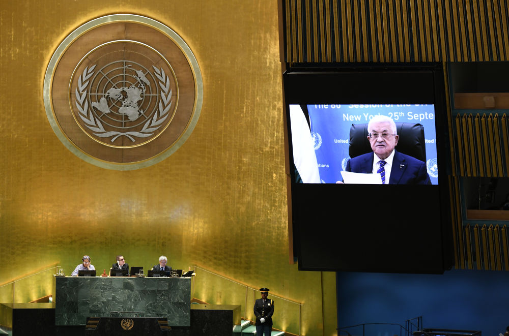 9月25日,在位于纽约的联合国总部,巴勒斯坦国总统阿巴斯通过视频方式在第80届联合国大会一般性辩论上发言。新华社记者 李睿 摄