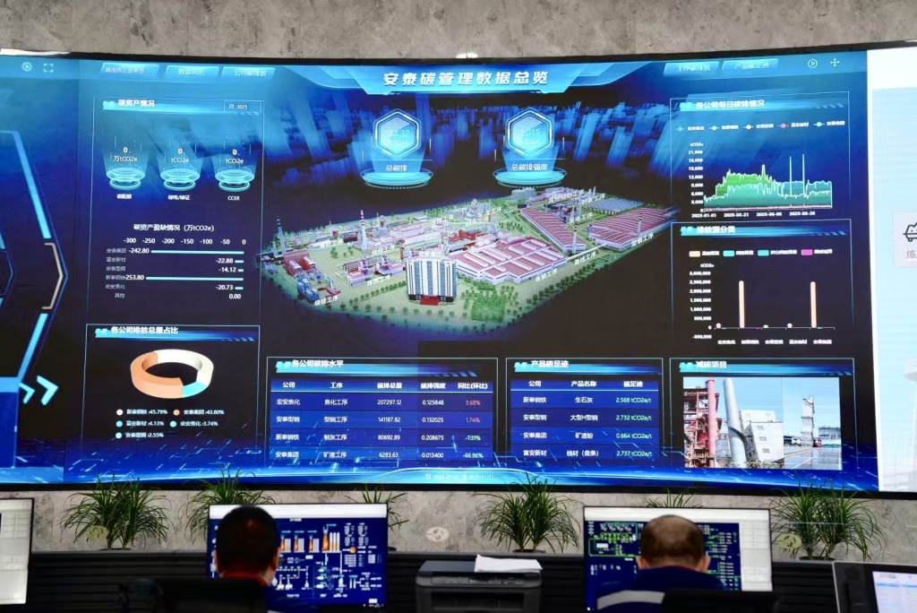 11月12日,在安泰智能管控中心,工作人员只需轻点碳资产管理云平台,即可追踪从原料到成品的八道生产工序中的碳排放动态与数据,并能一键跳转至各工序的详情页面,这也是山西全省首家碳资产管理平台。