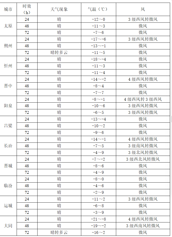 全省晴天间多云,风力减小,但气温仍然偏低。白天最高:北部及山区-4~3℃,中南部其余地区3~8℃;夜间最低:高寒地区-20℃左右,北部及山区-16~-10℃,中南部其余地区-10~-4℃。