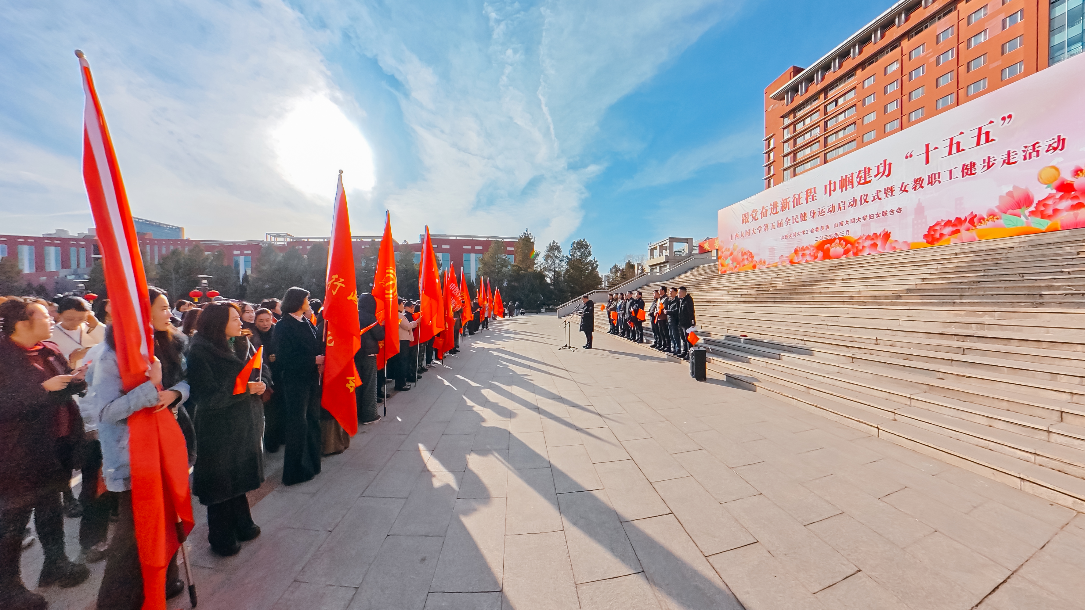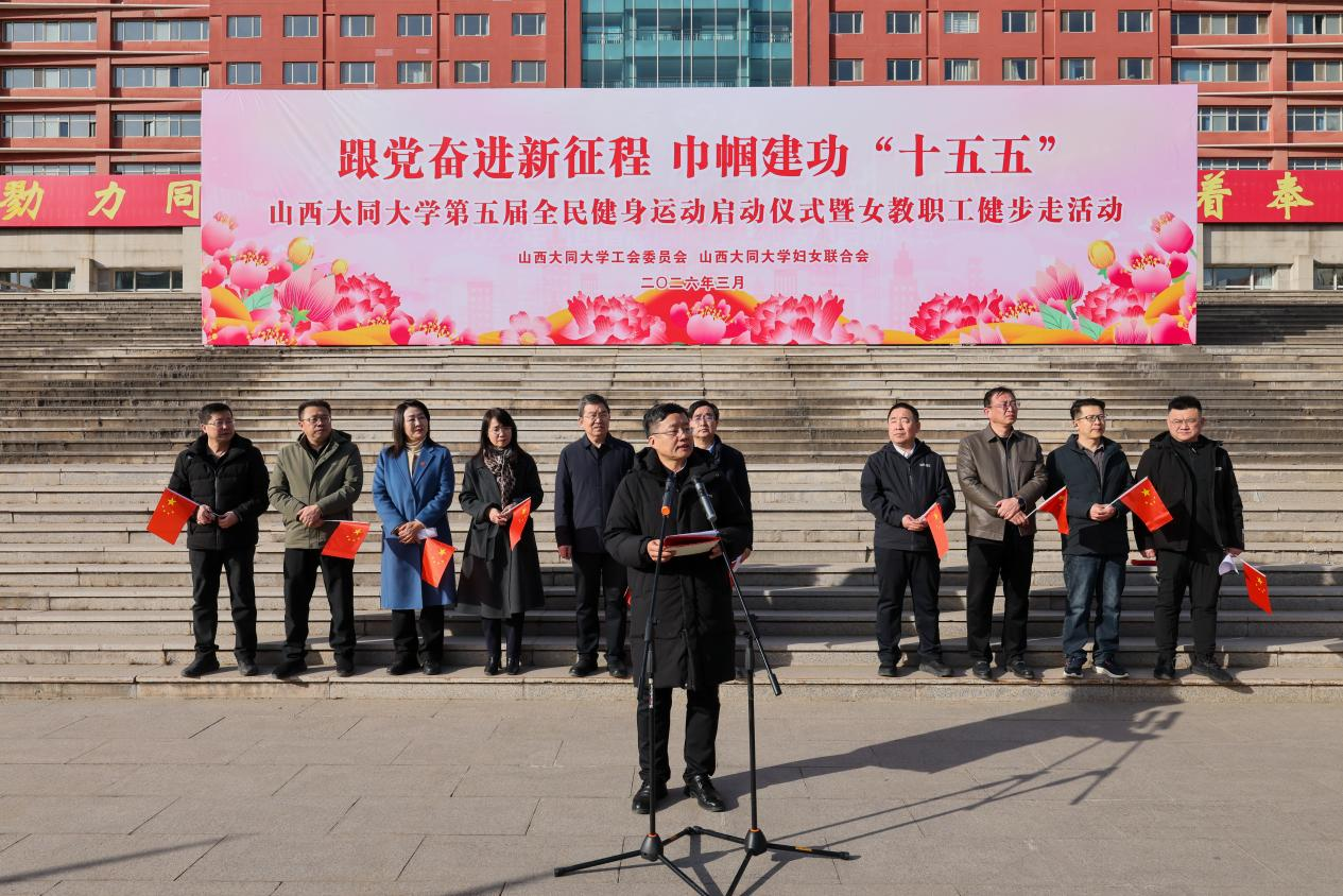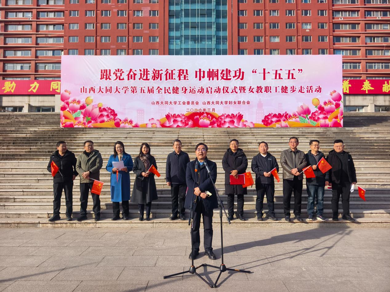 春风送暖迎佳节,巾帼建功绽芳华。为热烈庆祝第116个“三八”国际妇女节,深入践行全民健身国家战略,丰富教职工精神文化生活,凝聚全校巾帼力量助力学校高质量发展,3月6日下午,山西大同大学工会委员会和山西大同大学妇女联合会以“跟党奋进新征程 巾帼建功‘十五五’”为主题,在中校区行知楼喷泉广场隆重举行第五届全民健身运动启动仪式暨2026年庆祝“三八”妇女节女教职工健步走活动。学校党委高度重视、周密部署,校党委书记赵水民,校党委副书记张卫国,校党委常委、副校长张旻,校党委常委、组织部部长孙宏吉,校党委常委、宣传部部长王娟出席活动。校体育委员会委员、校工会委员会委员、校妇联执行委员会委员及全体工会会员参加活动,活动由校党委常委、副校长张旻主持。