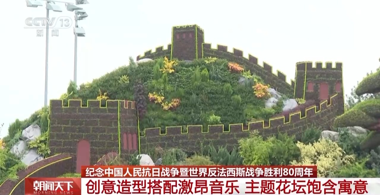 总台记者 邵薇:此次纪念活动,天安门广场的景观布置遵循“尚中”的原则,也就是以北京中轴线为主要通道,两侧对称布局。在颜色的选择上也相对统一且庄重,分别是红、金、绿。最具代表性的是这两座年号台,宛若两扇矗立的大门缓缓拉开一场大幕。同样,它也选择了长城这一国际性的文化符号。 最下方绿色的自然花境象征着大地,而在大地之上是缓缓升起、泛着金光的红日,不仅托举起两个重要的年份,更是象征着中华民族前进的曙光。在正式活动当中,三军仪仗队将会在人民英雄纪念碑下集结出发。