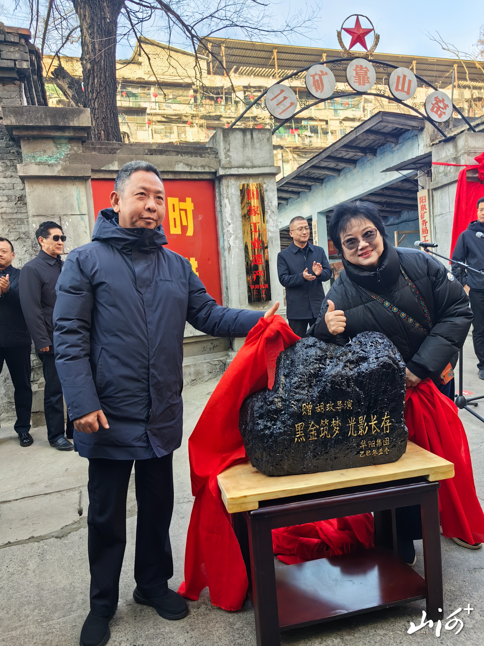 阳泉,因煤而兴;华阳,以煤立业。黝黑的“乌金”,曾照亮国家的工业征程,也筑就了这座城市最坚实的梦想。揭牌仪式现场,华阳集团还向胡玫赠送一份特殊礼物——“黑金筑梦 光影长存”的炭雕艺术品。它取材于华阳优质的无烟煤,是“乌金”的纯粹形态,更是工业历史的浓缩与沉淀。