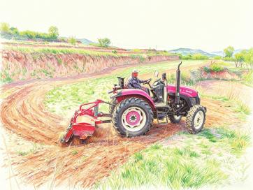 在该乡中心村旁的山坡上,惠农服务中心的农机手梁树孔驾驶红色拖拉机牵引旋耕机攀上窄坡,将杂草丛生的黄土翻耕得疏松平整。申达喜作为供销社社员,农机耕地服务每亩可优惠10元、播种每亩优惠5元、喷洒农药每亩优惠3—5元。