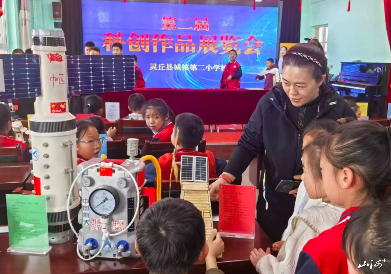 “快看,我的‘幻影战车’能转弯!”“这个空间站模型太像了!”……近日,灵丘县城镇二小校园里热闹非凡,第二届科创作品评选、展览及颁奖系列活动在此举行。全校各年级学生积极参与,共提交各类科创作品60余件,涵盖航天、物理、机械、环保等多个领域,孩子们用双手和智慧搭建起一座属于自己的“微型科技馆”。