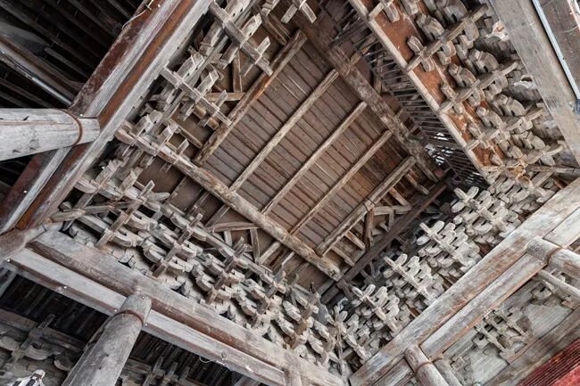站在楼心抬头仰望,梁架层叠如巨型的木质迷宫。阳光从高处的窗棂斜射而入,清晰照亮了数百组如云朵般簇拥的斗拱,也在梁、枋之间投下错落的光影。木构相生,榫卯相合,浑然一体,宛若天成。
