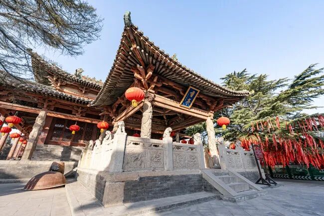 穿过飞云楼,便可见午门、献殿、香亭、正殿构成的壮阔序列,与飞云楼的精巧形成鲜明反差。午门面阔七间,单檐歇山顶,梁架用材粗犷、斗拱尺度硕大,虽经明代修缮,仍保留元代建筑古朴豪放的气质;献殿柱身略带弯曲,尽显元制不羁;明正德年间的香亭以精细石雕闻名,四根蟠龙石柱与栏板石狮形态各异,由附近村民捐建而成,石材、字体风格多样,凝聚着民间工匠的虔诚与巧思;正殿与香亭檐角相距极近,雨天正殿雨水先落香亭瓦檐再二次滴落,“雨中不湿鞋”的设计既减缓雨水冲刷,又节约用地,尽显古人智慧。