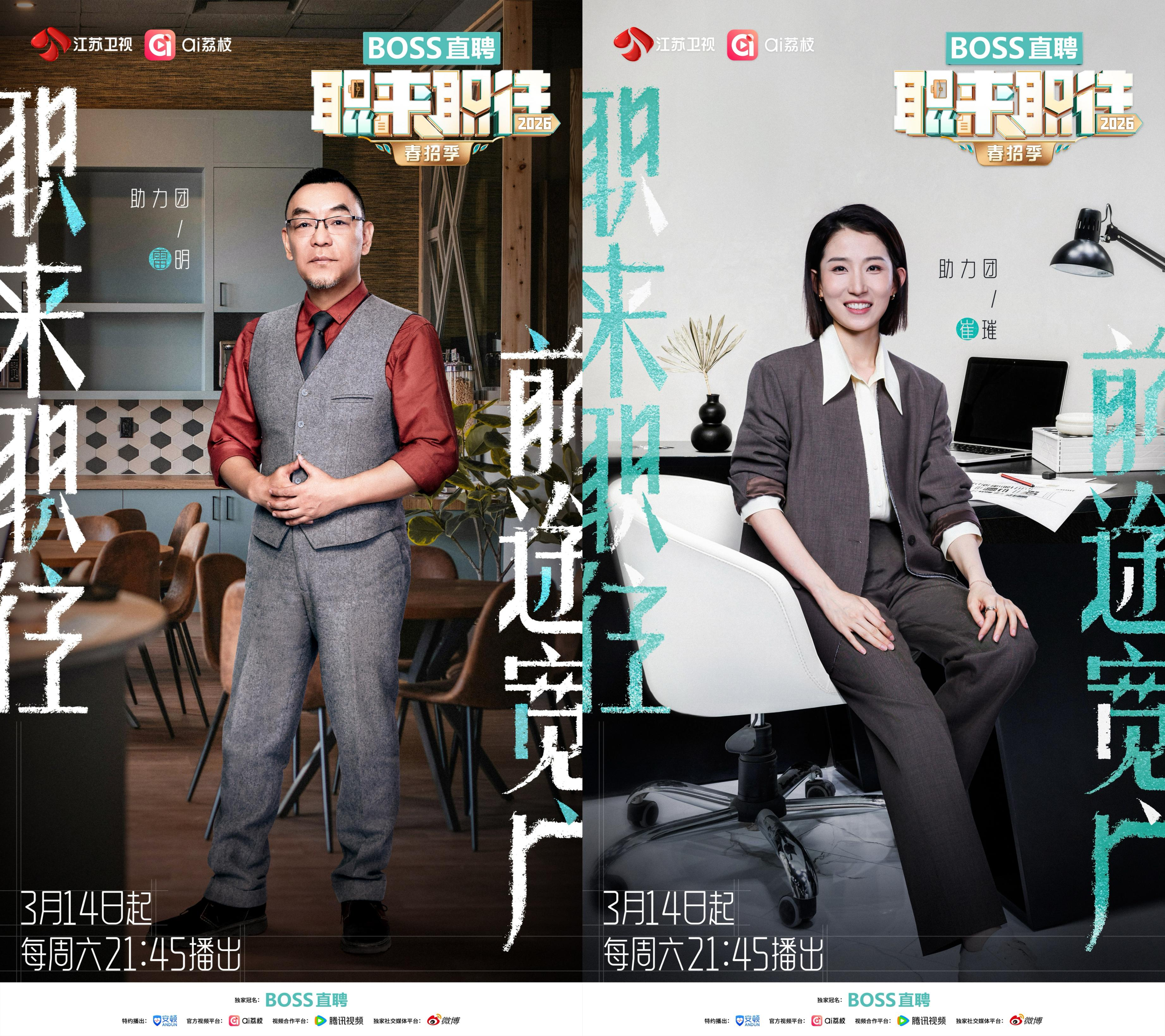 3月14日起,每周六晚9:45,敬请锁定江苏卫视、ai荔枝、腾讯视频,《BOSS直聘·职来职往2026》邀你共赴职场新约,见证每一位求职者闪闪发光的瞬间!
