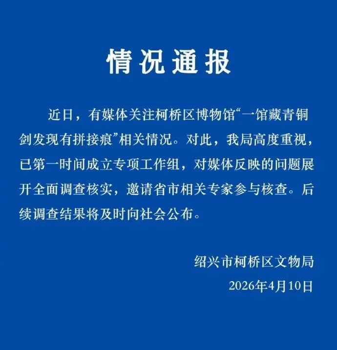 近日,有媒体关注柯桥区博物馆“一馆藏青铜剑发现有拼接痕”相关情况。对此,我局高度重视,已第一时间成立专项工作组,对媒体反映的问题展开全面调查核实,邀请省市相关专家参与核查。后续调查结果将及时向社会公布。