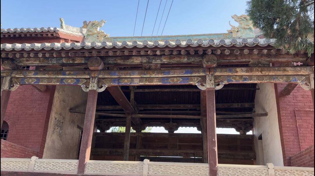 “这座元代戏台是府君庙的精华,是一座单檐歇山顶式的木结构建筑。主要特点就是它的顶部没有一根大梁椽木,不用一钉一铆,由细木交连层层向上构成穹顶。”郭壁村支委委员胡卫霞介绍道,戏台屋顶上为琉璃筒瓦、脊兽、鸱吻,都是元代构建。“琉璃瓦片是孔雀蓝色,非常珍贵。整个戏台古朴雅观,所以说古人的智慧让人佩服。”