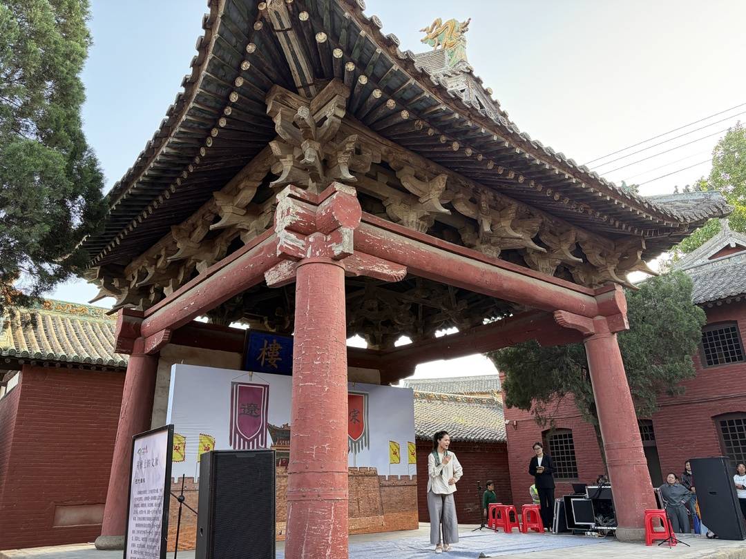 “王报二郎庙戏台,是由山西师范大学的师生团队在考察中发现。发现戏台时,里面杂草丛生,且天色已晚,只能从建筑形式上看是个元代以前的戏台,没有找到明确的文献记载。直到第二天,他们把戏台中间的杂草拔除干净后,发现了‘时大定二十三年’字样。由此,这座建于金大定二十三年,也就是1183年的戏台出现在了世人面前。”山西师范大学副教授邓弟蛟登台,介绍到了这方戏台的发现故事。