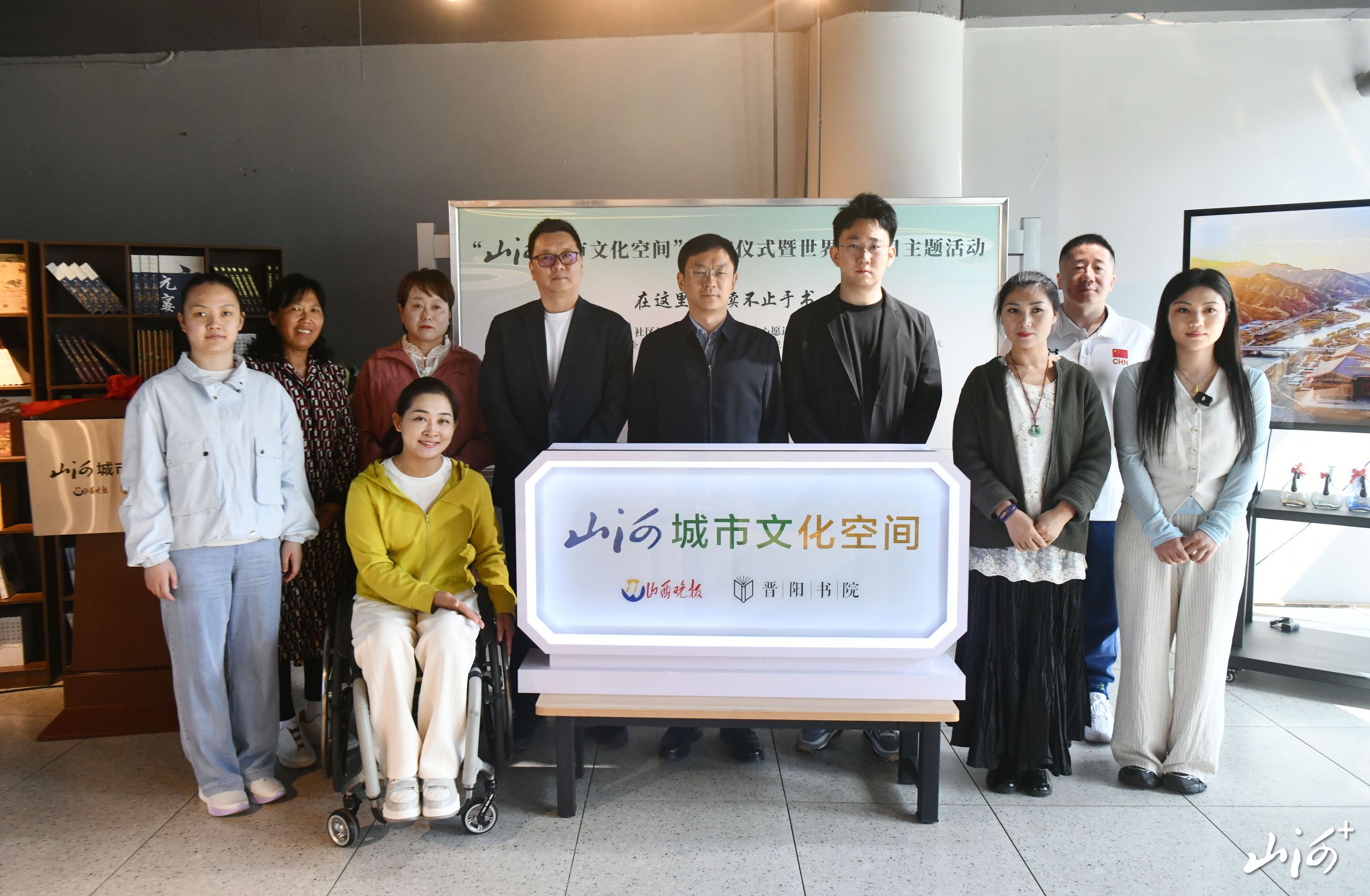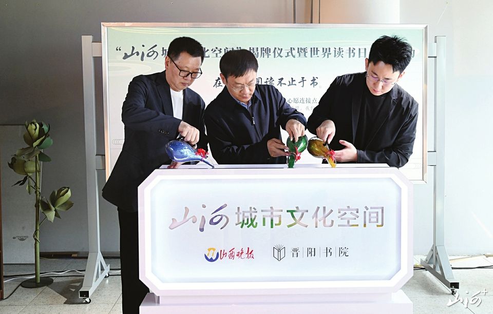 山西晚报·山河+讯  4月18日上午,由山西晚报与晋阳书院联合打造的“山河城市文化空间”在晋阳书院(晋阳里)正式揭牌成立。山西日报传媒集团党委副书记、副董事长、总经理郭文礼,山西日报传媒集团《山西晚报》社有限责任公司执行董事、社长李广义,晋阳书院主理人刘宏凯共同揭牌。50余位读者、社区居民到场见证,现场座位坐满后,仍有不少读者站着听完全程,过道和书架旁也围满了人。