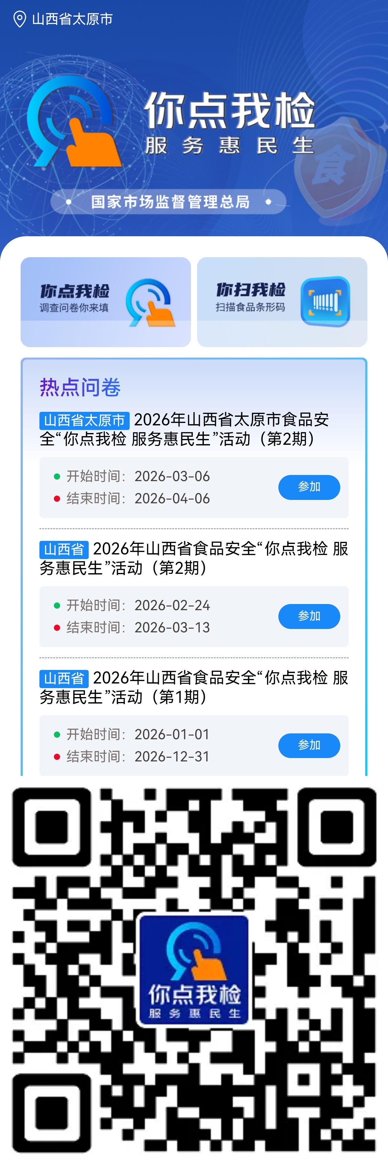 线上方面,广大消费者则可通过扫描下方二维码,进入“你点我检”民意征集系统,填写专题调查问卷。消费者可以根据日常关心和实际需求,选择希望检测的食品品种、检验项目、抽样场所等信息。省市场监管局将根据公众投票结果,组织专项食品抽样检验,并及时通过官方网站公布检验结果。如发现不合格食品,将依法从严从快开展核查处置,切实守护人民群众“舌尖上的安全”。