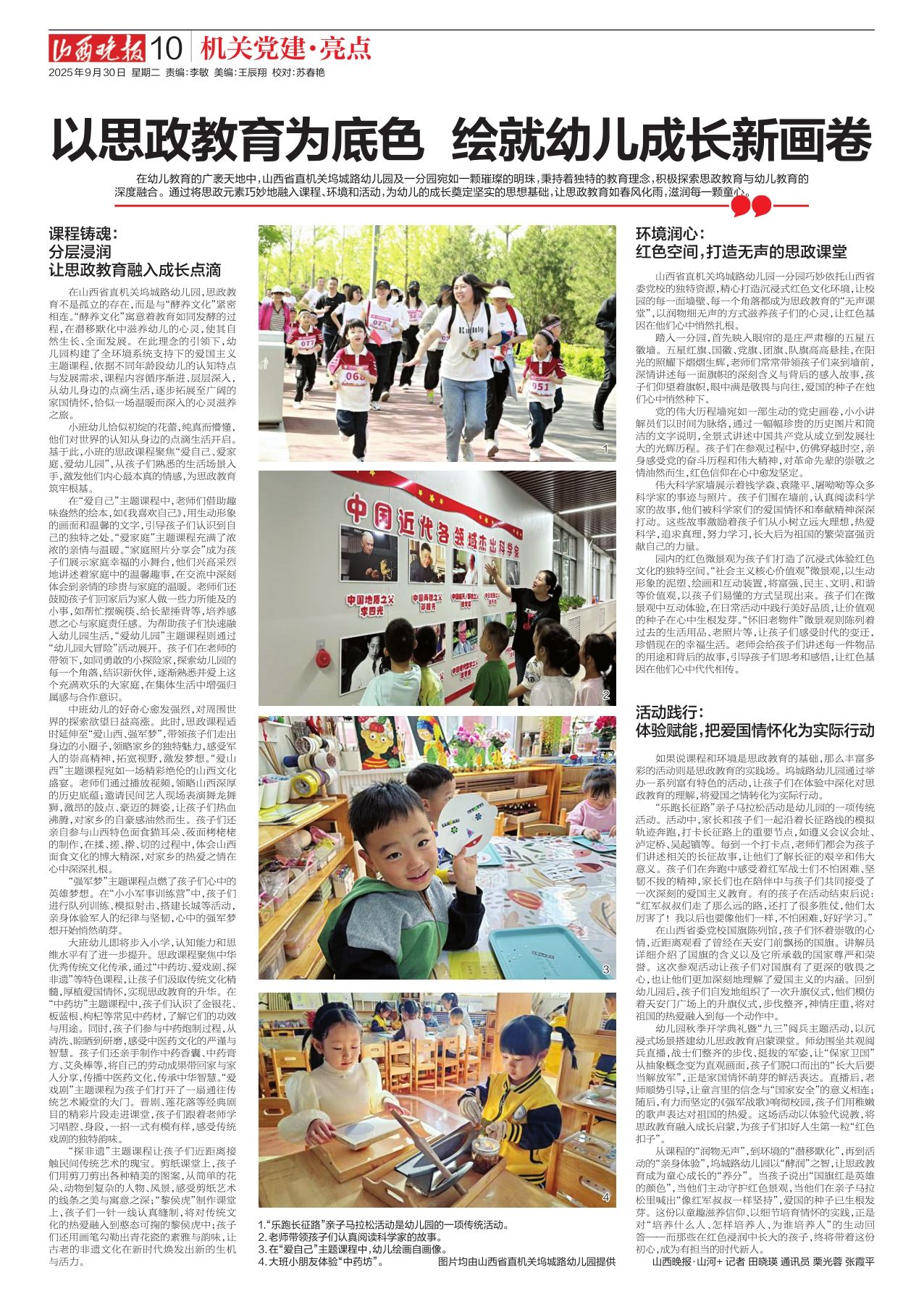 在山西省直机关坞城路幼儿园,思政教育不是孤立的存在,而是与“酵养文化”紧密相连。“酵养文化”寓意着教育如同发酵的过程,在潜移默化中滋养幼儿的心灵,使其自然生长、全面发展。在此理念的引领下,幼儿园构建了全环境系统支持下的爱国主义主题课程,依据不同年龄段幼儿的认知特点与发展需求,课程内容循序渐进、层层深入,从幼儿身边的点滴生活,逐步拓展至广阔的家国情怀,恰似一场温暖而深入的心灵滋养之旅。